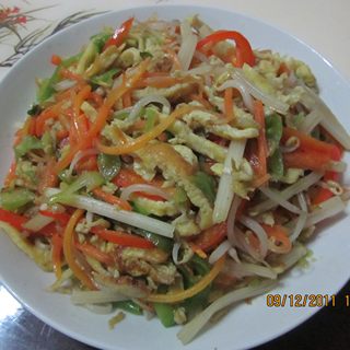 原料:鸡蛋、胡萝卜、芹菜、青辣椒、红辣椒、植物油、鸡精、盐、葱丝、白糖。