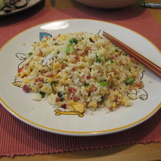 原料:大米、鸡蛋、火腿丁、葱、烹调油、盐。
