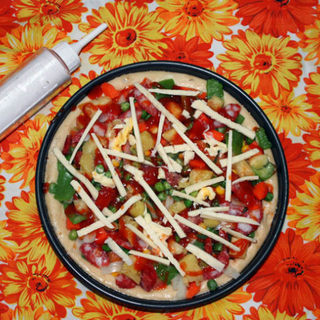 原料:匹萨皮、高筋面粉、温水、芝士、甜椒、胡萝卜、洋葱、青豆、玉米粒、香肠、糖、盐、橄榄油、番茄酱。