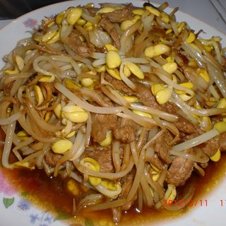 原料:黄豆芽、肉丝、糖、醋、盐、胡椒、料酒、生抽。