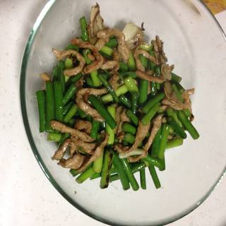 原料:瘦肉、蒜苔、大蒜、生姜、酱油、生粉、花椒粉、料酒。
