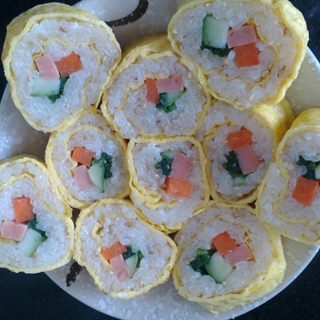 原料:江米饭、黄瓜、胡萝卜、菠菜、香肠、鸡蛋、白芝麻。