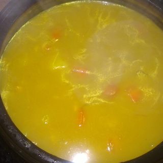 原料:猪肉、土豆、胡萝卜、洋葱、虾仁、葱、淘米水、咖喱粉。