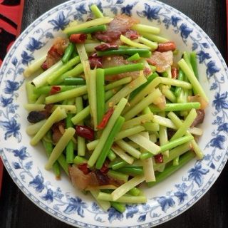 原料:蒜苔、腊肉、干辣椒段、盐。