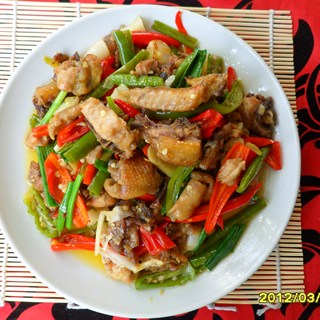 原料:童子鸡、青红辣椒、泡椒、蒜、姜、葱、花椒油、盐、鸡精、酱油。