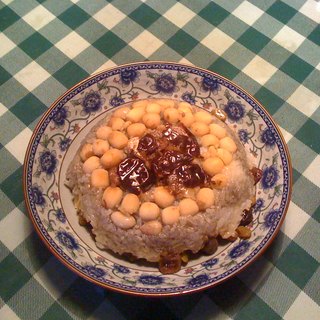 原料:江米、红枣、莲子、葡萄干、桂圆、赖汤圆馅、核桃、花生。