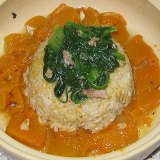 原料:南瓜、莴笋叶、金枪鱼罐头、米饭、蒜、香油、盐。