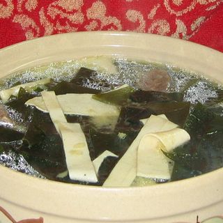 原料:鲜海带、五香豆皮、姜、葱、香肠。