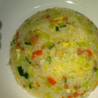 原料:米饭、鱿鱼、胡萝卜、青椒、洋葱、鸡蛋、盐、姜、葱段、味精。