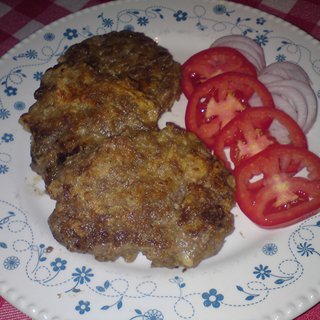 原料:牛绞肉、洋葱、鸡蛋、蕃茄、黑胡椒粉、食盐、食用油、面粉、蕃茄沙司、沙拉酱。