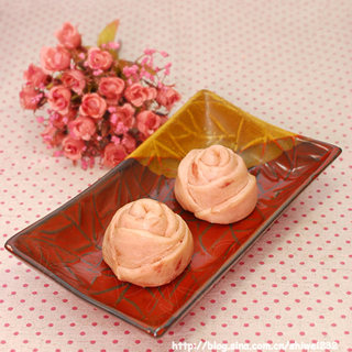 原料:中筋面粉、干酵母、泡打粉、水、玫瑰酱、烘焙用百年草粉。