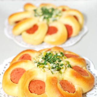 原料:金像高筋面粉、细砂糖、盐、奶粉、干酵母、鸡蛋、水、黄油、装饰、绿葱叶碎、沙拉酱、盐、黑胡椒。