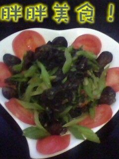 原料:芹菜、黑木耳、香菇、西红柿、葱、盐。