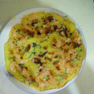 原料:鲜虾、鱿鱼、鸡蛋、面粉、葱、胡萝卜、盐、鸡精。