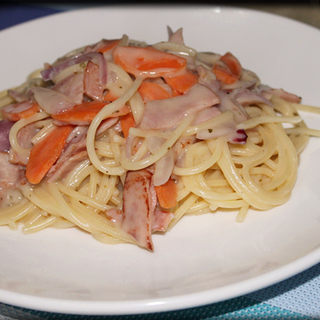 原料:意面、火腿、培根、洋葱、胡萝卜、黄油、淡奶油、鲜奶、面粉、香草、盐。