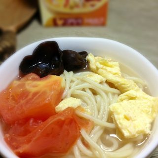 原料:拉面、史云生原汁上汤、番茄、鸡蛋、黑木耳、橄榄油、盐。