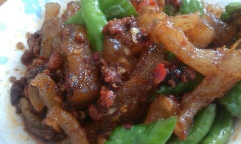 原料:羊筋、羊肉肉末、青椒、小米椒、蒜片、葱段、姜末、辣酱、鸡精、羊汤、盐、白糖、料酒。