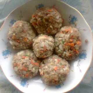 原料:新鲜莲藕、胡萝卜、洋葱、猪肉、淀粉、葱、姜、盐、糖、味精。