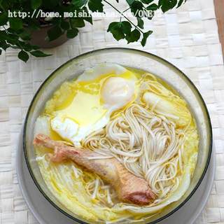 原料:土鸡、葱、老姜、盐、鸡蛋、蔬菜、素面、鸡油、娃娃菜。