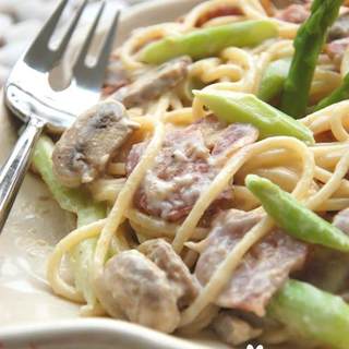 原料:意面、芦笋、蘑菇、洋葱、鲜奶、淡奶油、培根、面粉、黄油、罗勒。