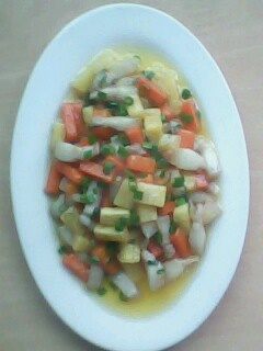 原料:五花肉、菠萝、红萝卜、葱花、水淀粉、盐、味精、鸡精、糖。