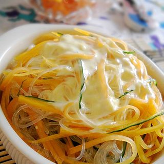 原料:木瓜、粉丝、黄瓜、沙拉酱、白醋、熟油。