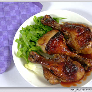 原料:琵琶腿、红酒、糖、盐、老抽、洋葱、生菜。