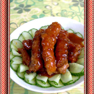 原料:猪腿肉、番茄酱、生粉、盐、糖、料酒、黄瓜。