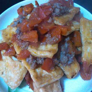原料:老豆腐、肉末、西红柿、盐、糖、生抽。