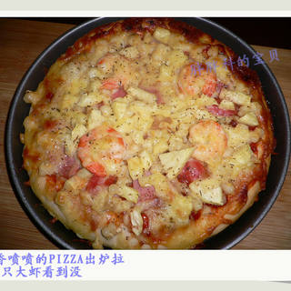 原料:高筋面粉、酵母 3g、火腿、烤肠、菠萝、大虾、番茄酱 盐 黄油 黑胡椒粉、奶酪丝。