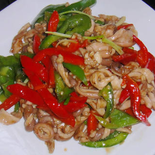 原料:冰鲜鱿鱼、蒜米、青椒粒、洋葱粒、葱段、红椒丝、生抽、蚝油、鸡精。