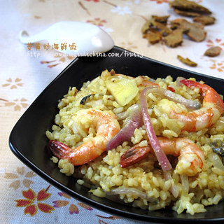 原料:干贝、鲜虾、青鱼肉、隔夜米饭、洋葱、姜黄粉、盐。
