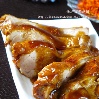 原料:红花、核桃碎、去骨鸡腿、酱油、料酒、糖。