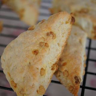 原料:高筋粉、低筋粉、黄油、冷牛奶、幼砂糖、盐、泡打粉、太妃糖巧克力。