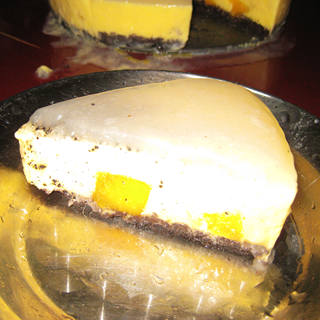 原料:芒果、鲜奶油、牛奶、糖、奥利奥饼干、吉利丁片、黄油、火龙果。