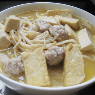 原料:豆腐、金针菇、肉糜、油、盐、生抽。