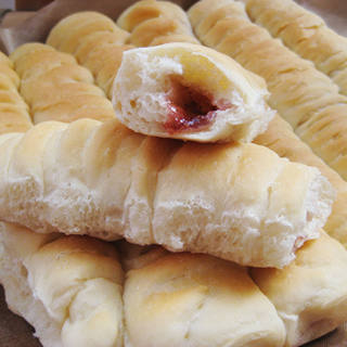 原料:高筋面粉、低筋面粉、干酵母、白砂糖、盐、全蛋、鸡蛋液、水、黄油、草莓果酱。