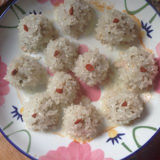 原料:糯米、肉末、蛋清、葱、枸杞、酱油、料酒、盐。