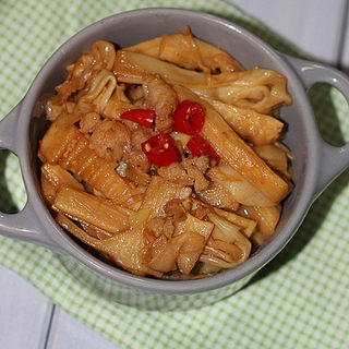原料:猪肉、竹笋、辣椒、蒜、姜、盐、白糖、酱油。