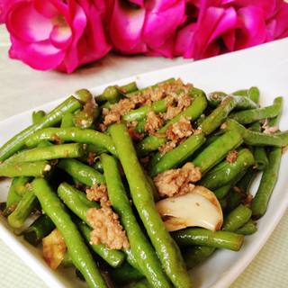 原料:豆角、瘦肉、大蒜、盐、酒、酱油、花生油。