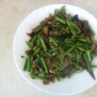 原料:豆角、茄子、蒜、生抽、盐、油。