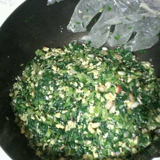 原料:面粉、萝卜缨、鸡蛋、虾仁、食用油、猪油、酱油、胡椒、盐、大葱。