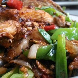 原料:草鱼、洋葱、小葱、生姜、大蒜、泡辣椒、花椒、青椒、面粉、酱油、料酒、蚝油、豆豉。