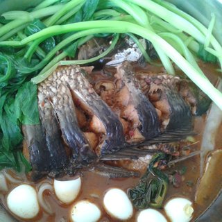 原料:鲤鱼、油菜、土豆粉、豆腐皮、鹌鹑蛋、小葱、生姜、大蒜、酱油、料酒、胡椒粉、黄豆酱、高汤。