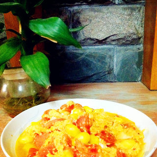 原料:西红柿、鸡蛋、白果、蒜头、黄油、白糖、食盐、胡椒粉。