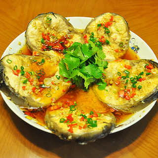 原料:草鱼、葱、姜、红色辣椒、香菜、盐、胡椒、生抽、料酒、糖、、蒸鱼豉油。