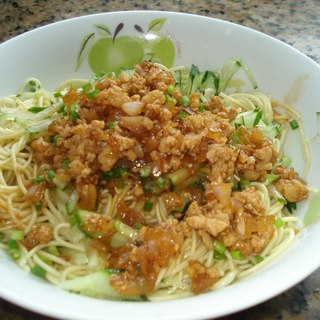 原料:面条、猪肉、黄瓜、洋葱、甜面酱、番茄酱、姜末、葱盐、鸡精、香油。