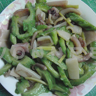 原料:苦瓜、鱿鱼、姜、食用油、盐、生抽、生粉。