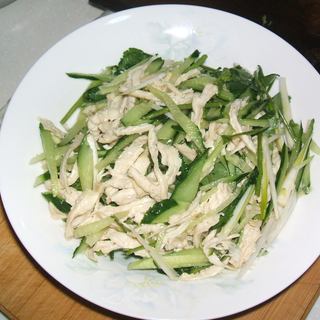 原料:鸡胸肉、黄瓜、胡椒粉盐、葱丝、芝麻、香油、胡椒粉盐。