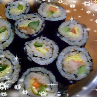 原料:白米饭、黄瓜、西红柿、紫菜、鸡蛋、白糖。